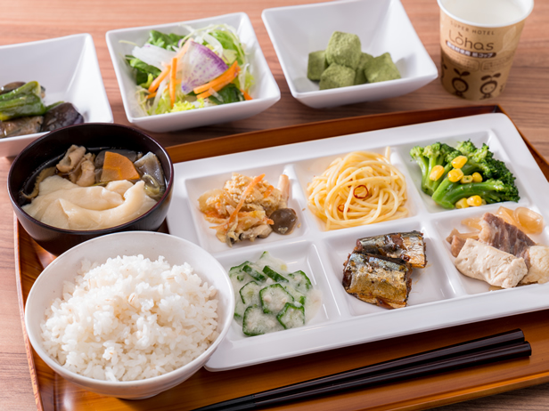 無料のビュッフェ朝食では、オーガニックサラダや岩手県の郷土料理「ひっつみ汁」などあります。宿泊の際は、ぜひお召し上がりください。