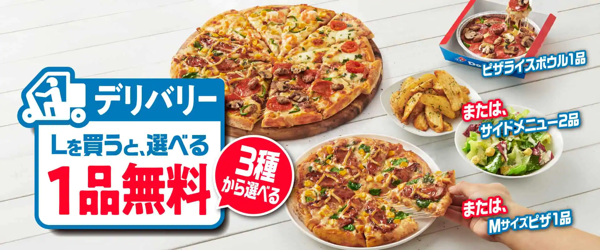 ドミノ・ピザ盛岡月が丘店 デリバリーLを買うと、3種から選べる1品無料!