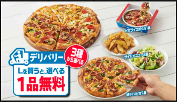 お好きなLサイズピザまたはニューヨーカーピザを買うと、もう1品無料でついてくる