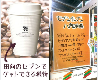毎月7の付く日と11日は田向アプリカフェの日。 レジカウンターでセブンアプリご提示でセブンカフェホット(R)をプレゼントいたします。