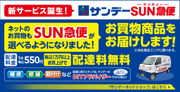 全店共通!お買い物商品をお届け!税込10,000円以上のネットショップでの購入の場合、配達料無料!詳しくはこちらのページから https://shop.sunday.co.jp/sunkyubin.html#sunkyubin