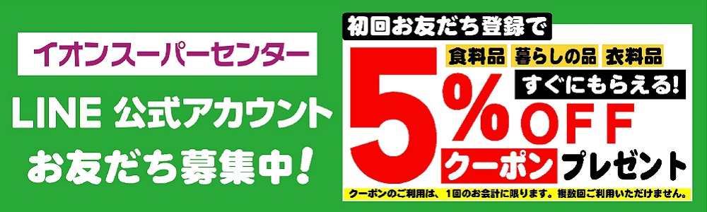 イオンスーパーセンターではLINE公式アカウントをお友だち登録初回限定で衣料品、暮らしの品、衣料品で使える5%offクーポンがすぐにもらえます。まだお友だち登録されていないお客様はぜひこの機会にお友達登録をしてクーポンをもらいましょう。