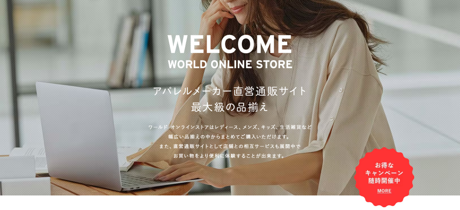 ワールドオンラインストアはレディース、メンズ、キッズ、生活雑貨など幅広い品揃えの中からまとめてご購入いただけます。また、直営通販サイトとして店舗との相互サービスも展開中でお買物をより便利に体験することができます。