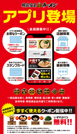 アプリ会員登録をすると、トッピングや麺大盛りなどが無料になるクーポンが貰えます。 また、スタンプを10個貯めるとラーメン(並)1杯無料になるスタンプカードアプリも利用できます。